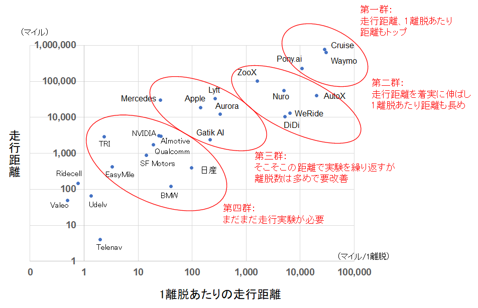 次に、縦軸に自動運転での走行距離を取り、横軸に1離脱までの走行距離を取って各社をプロットしてみると以下のようになる。大まかには、4つの群に分けることができそうだ。(なお、グラフは対数となっているため、要注意)