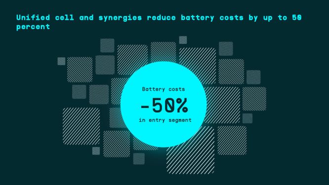 この統合セルの量産によるコスト低減効果と、各セグメントにおけるセル設計の工夫により、エントリーレベル向けの電池で最大50%、標準モデル向けの電池で最大30%のバッテリーコスト低減を目標としている。