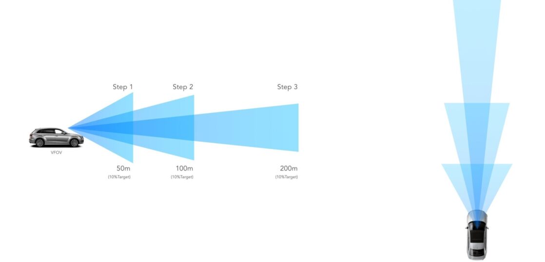 これは、複数のセンサーヘッドを必要とせずに、道路プロファイル、道路の破片、長距離の車線マーキングを検出し、隣接する車線の交通を「同時に」検出することができる。最大検出距離は200m(反射率10%)であるが、今回開発した機能により、異なるFOVを持った50mレンジの物体検知と100mレンジの物体検知を行うことができる。