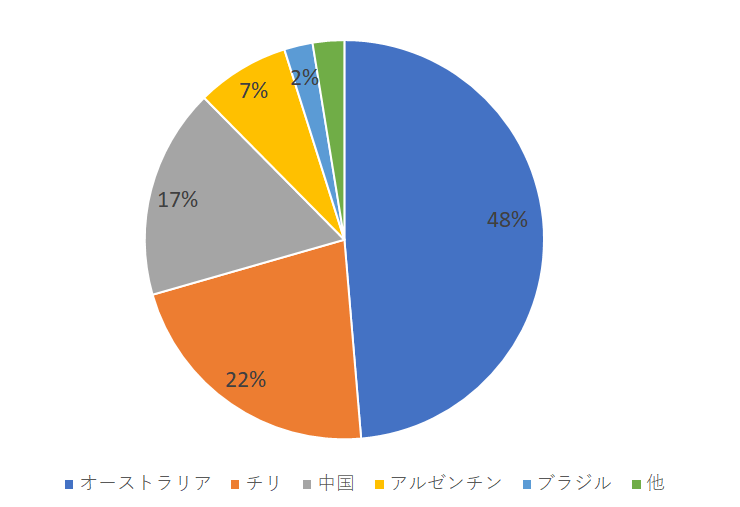 そして生産量で見ると、おおよそ全体の約80%をオーストラリア・チリ・中国の3か国で占めている。