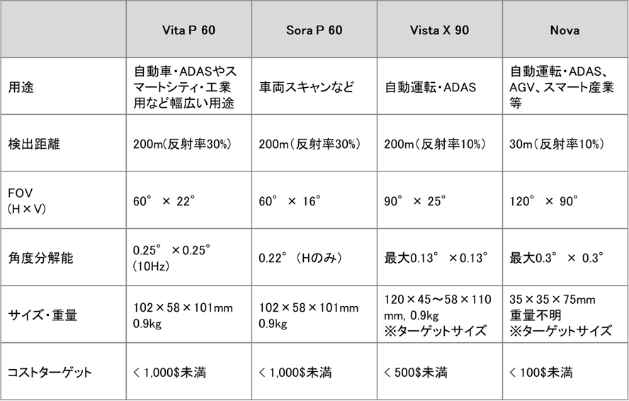 同社の製品ラインナップから見えるLiDARのスペックは以下の通りである。